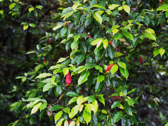 山杜英的主干笔直挺拔,高可达18米,胸径能长到38厘米以上。树皮淡灰或黄灰色,小枝纤细光滑,老枝则呈暗褐色,透着几分岁月的痕迹。树冠呈尖塔形,冠层厚密,顶端优势明显,一眼就能认出来。叶子呈纸质,倒卵形或倒披针形,边缘带着钝锯齿或波状钝齿。叶面深绿光亮,叶背颜色稍浅,两面都光滑无毛,摸起来手感很清爽。一年四季总能在树冠中看到几片红叶点缀其间,霜后红叶更多,红绿相间,像给大树戴上了一串红玛瑙项链,平添几分风韵。花朵总状花序从枝顶的叶腋里垂下来,花朵白色,花瓣上半部分撕裂成流苏状,像一把把细碎的小刷子,别致又耐看。果实是椭圆形的核果,成熟时由绿转暗紫,像一串串迷你的紫葡萄挂满枝头。