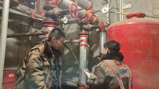 工程部高同安、尹志强在消防泵房,检查消防管道压力表是否达到压力标准,并做实时记录。