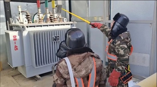 室外零下24℃,伊利托物流基地工程部孙东洋、尹志强头戴棉质安全帽,手戴绝缘手套,持高压验电笔杆,正在检查高压箱内变压器高压侧有没有发生漏电。