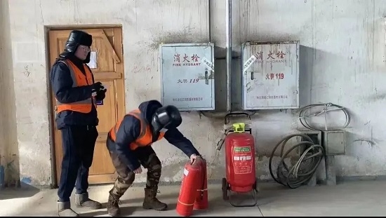 安监部刘林林、高君义在2号库房检查消防设备的压力情况,如发现灭火器过期或掉压问题及时更换,同时做好检查记录。