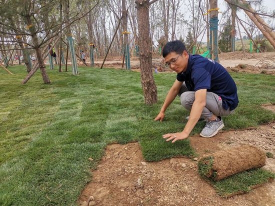 生态修复,严控品质。林场集团所属中林生态环境一线员工正在铺植草皮,确保每卷草皮侧边及顶端与相邻草卷紧密结合,使草坪铺植面平整,保证草坪美观。