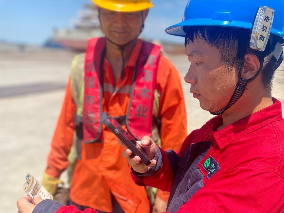 为确保公司上线人员、机械手续的合规合法性,烈日当空,2#泊位木材装船作业现场,中林新民洲港当班安环员张宇正在检查上线人员证件合规情况。