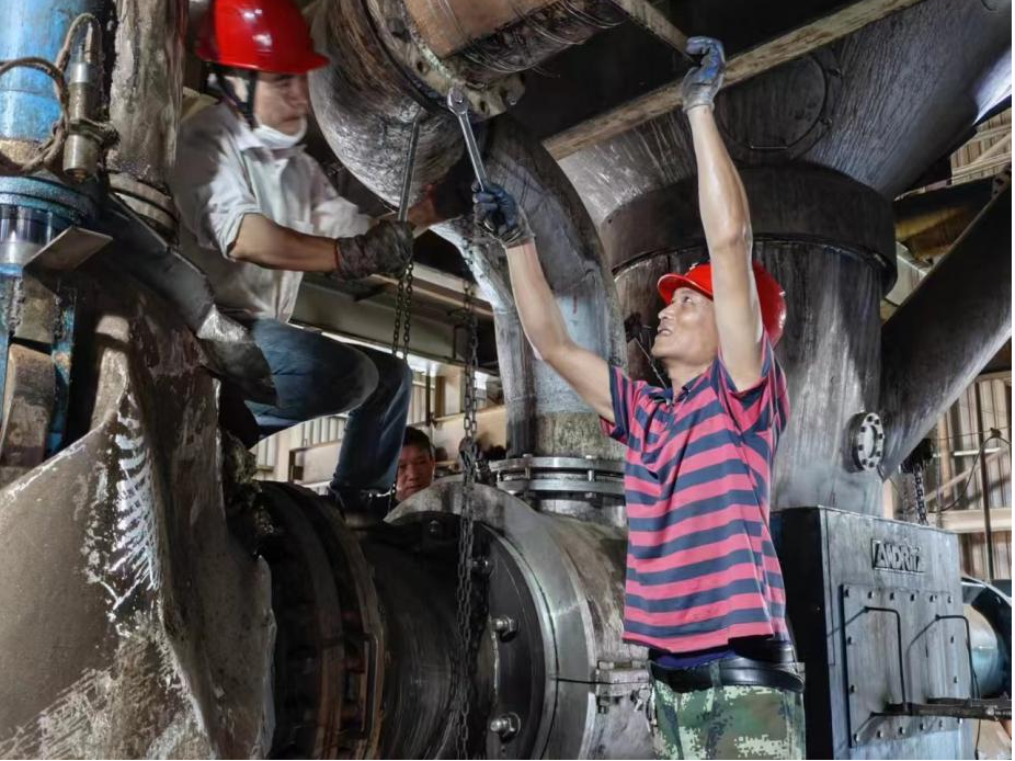 永安人造板厂生产车间热磨工段,郑海山和黄春来在为机器保养维护木塞螺旋更换筋条。