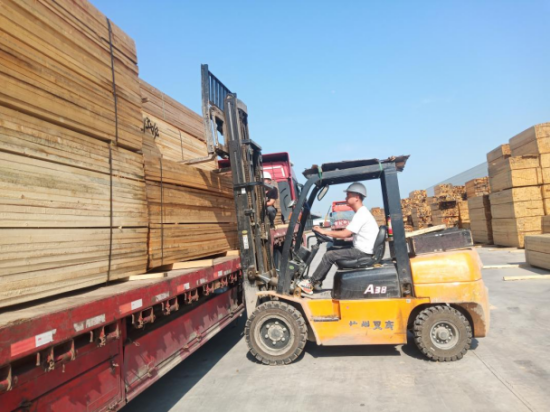 严格把关 安全生产 林场集团所属西安中林国铁物流的叉车司机(装车员)根据客户选材的种类和规格,从货场不同木材堆垛中,找到对应品类,叉取木材运送到货车上,在不超重、不超高的范围之内合理装车摆放,确保货车运输途中木材安全。(摄影:杨霜)