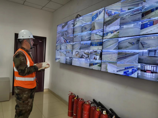 林场集团所属满洲里伊利托物流基地安监部陈亮正在查看监控屏,检查场区安全、交通、作业等情况,及时记录,发现异常情况第一时间向工程部报修、处置,并做每日小结。(摄影:何子达)
